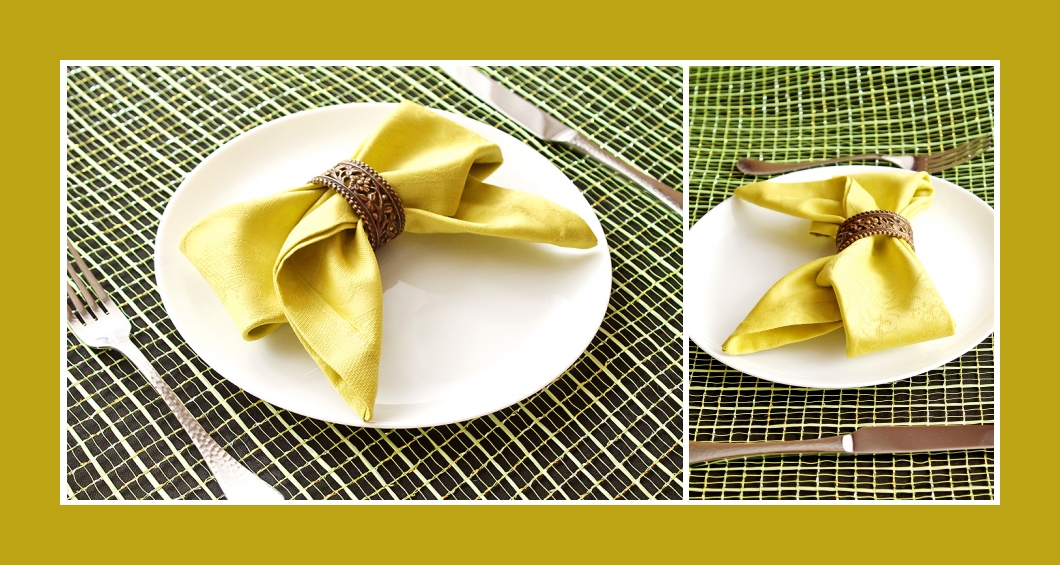 Um ihre Serviette in Schleife zu falten, braucht man ein Stoffstück in Gelb. Sie können zweifellos mit beliebigen Farben experimentieren. Man soll die obere Kante dieser Serviette einmal nach unten falten, damit ein doppelseitiges Dreieck entsteht. Befestigen Sie Ränder der Serviette für zwei Sekunden.